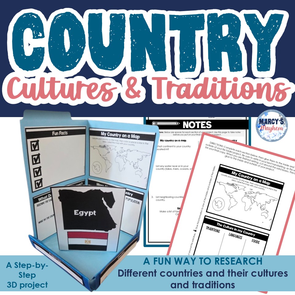Take your students on a journey around the world with this interactive country research project! Using the variety of worksheets, students explore cultures, traditions, landmarks, food, language, and geography while creating a meaningful 3D folder display that showcases their learning. This project develops research, writing, and organizational skills, as well as global awareness, while keeping students highly engaged.